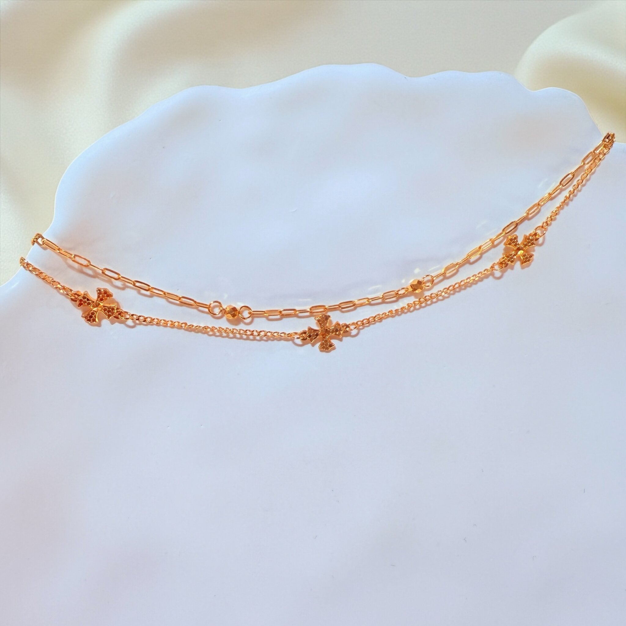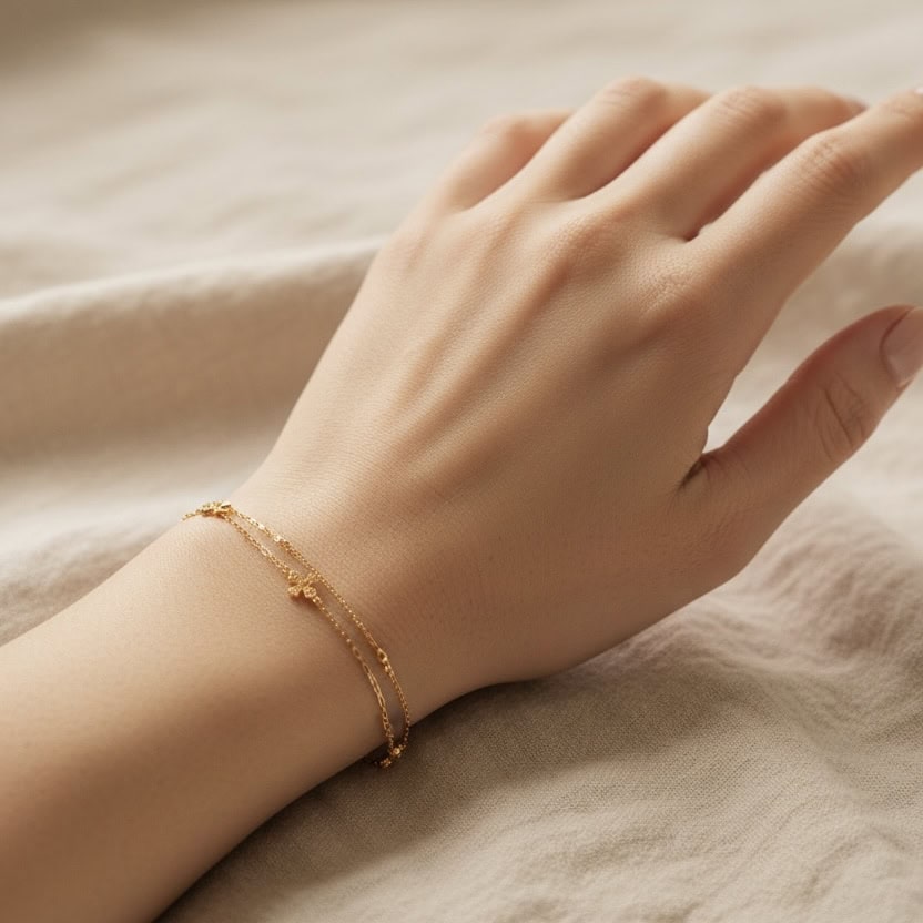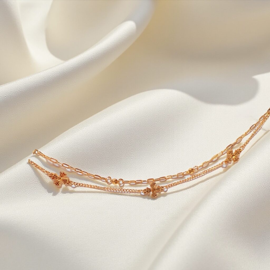 以小十字為亮點的雙層細鍊,線條極簡而輕盈,展現恬靜而柔和的質感光芒。適合日常穿搭疊戴,一抬手就能呈現低調而優雅的層次魅力。