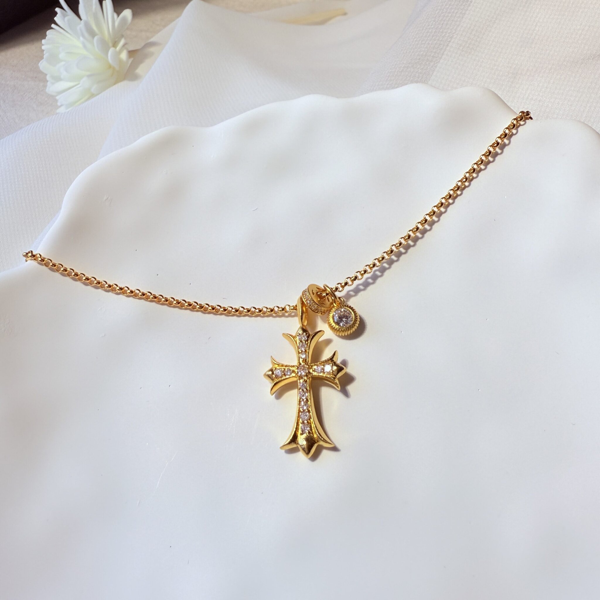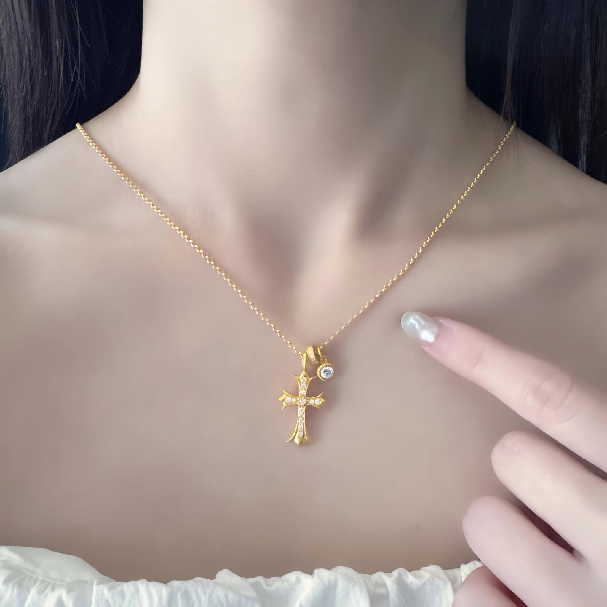 閃耀十字設計結合純金與鑽飾,象徵守護與信念。簡約卻不失高雅,適合日常配戴或作為珍貴祝福禮物。