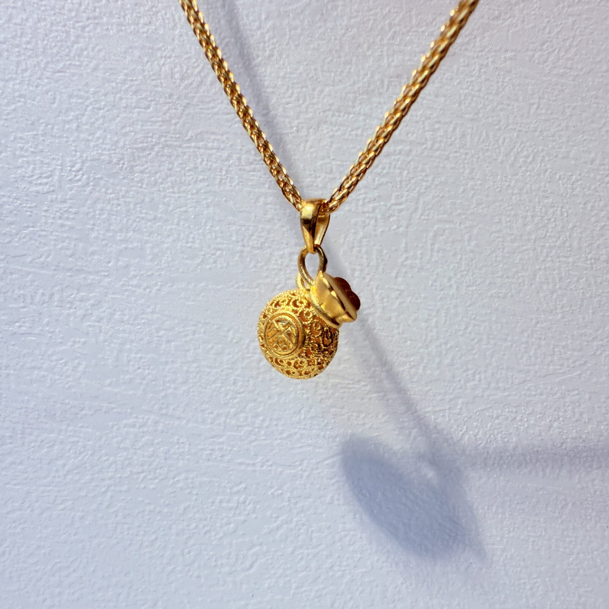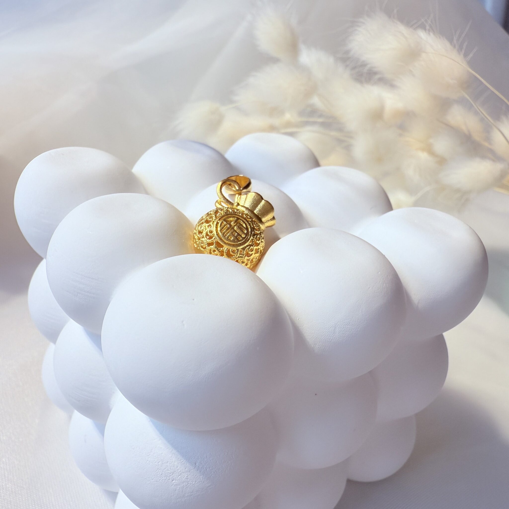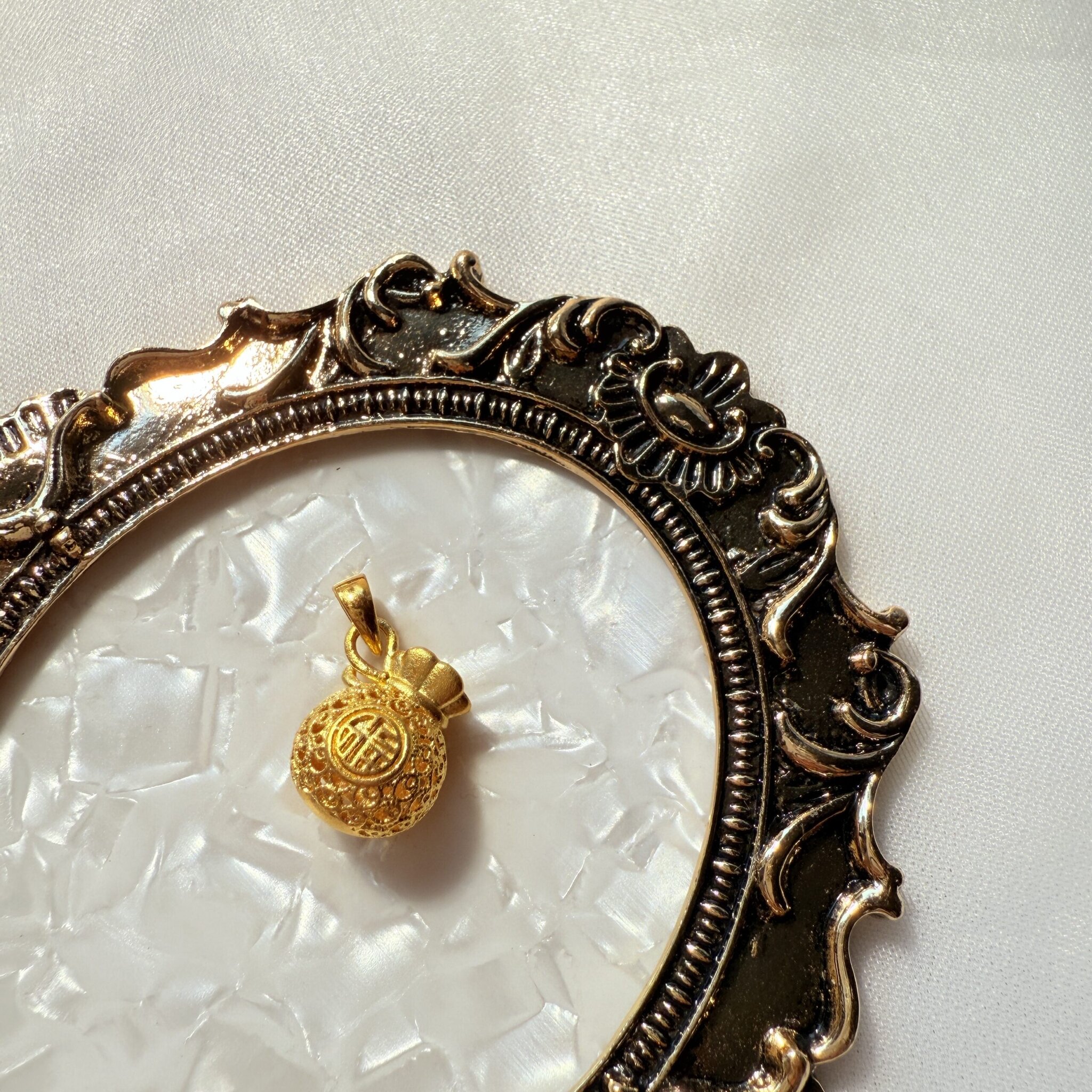 24K黃金福袋造型,細緻雕花與「福」字圖案,聚寶福袋墜寓意財富聚集與福氣常伴,送禮自用皆宜。