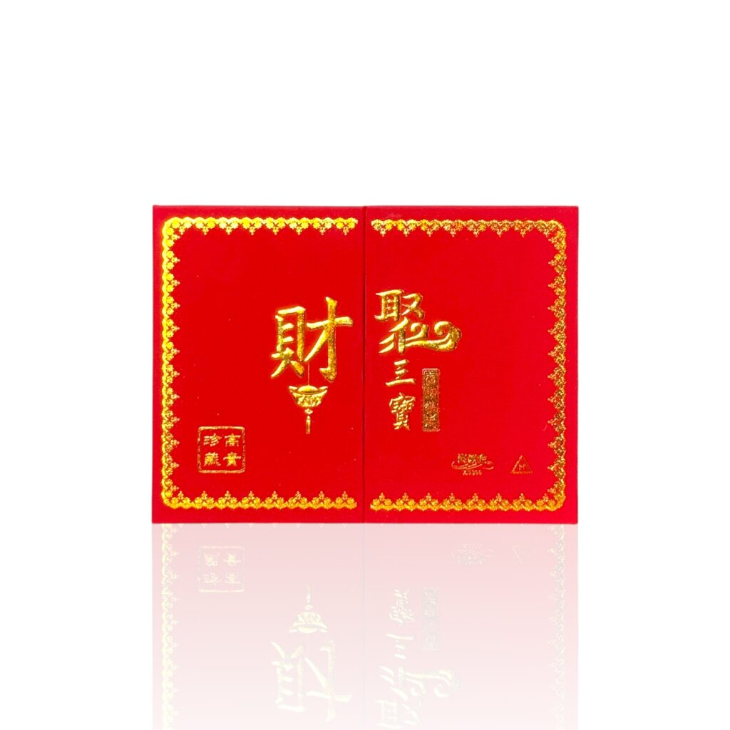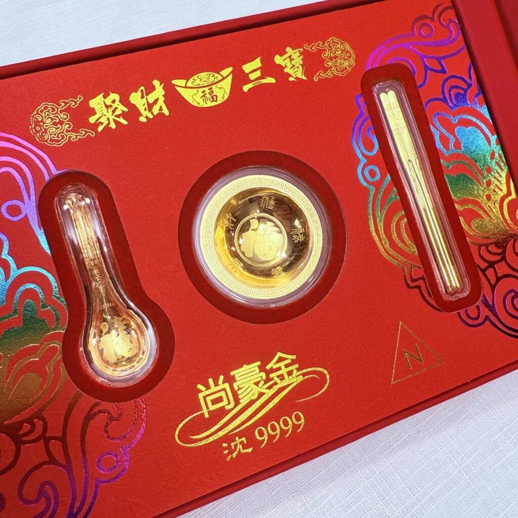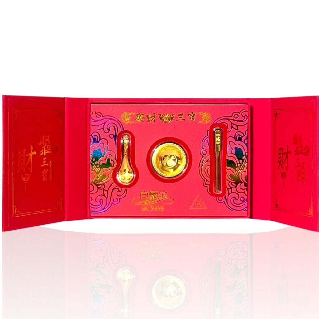 9999 純金聚財三寶禮盒,內含金碗、金筷、金湯匙;福字與紋飾立體精緻,質感厚實有份量。象徵食祿豐盈、財運相隨,適合喬遷開幕與年節贈禮。
