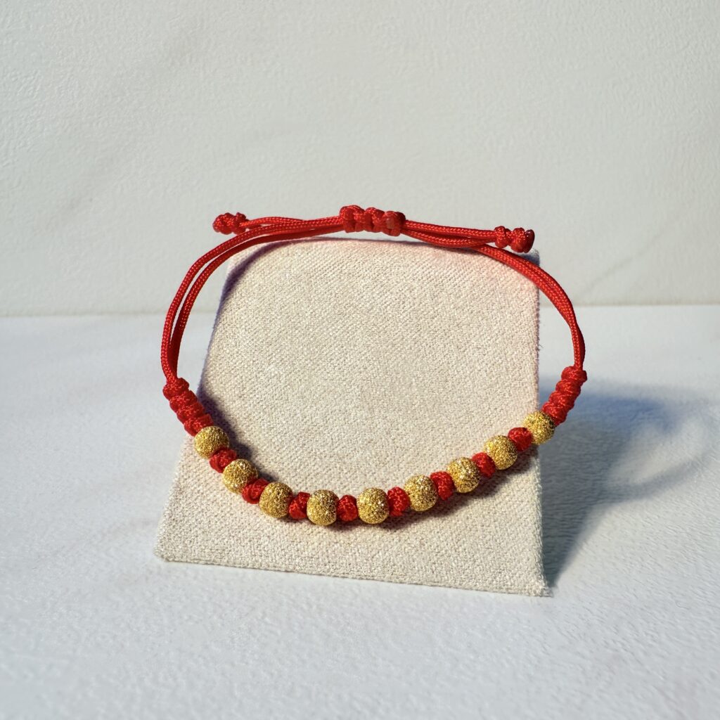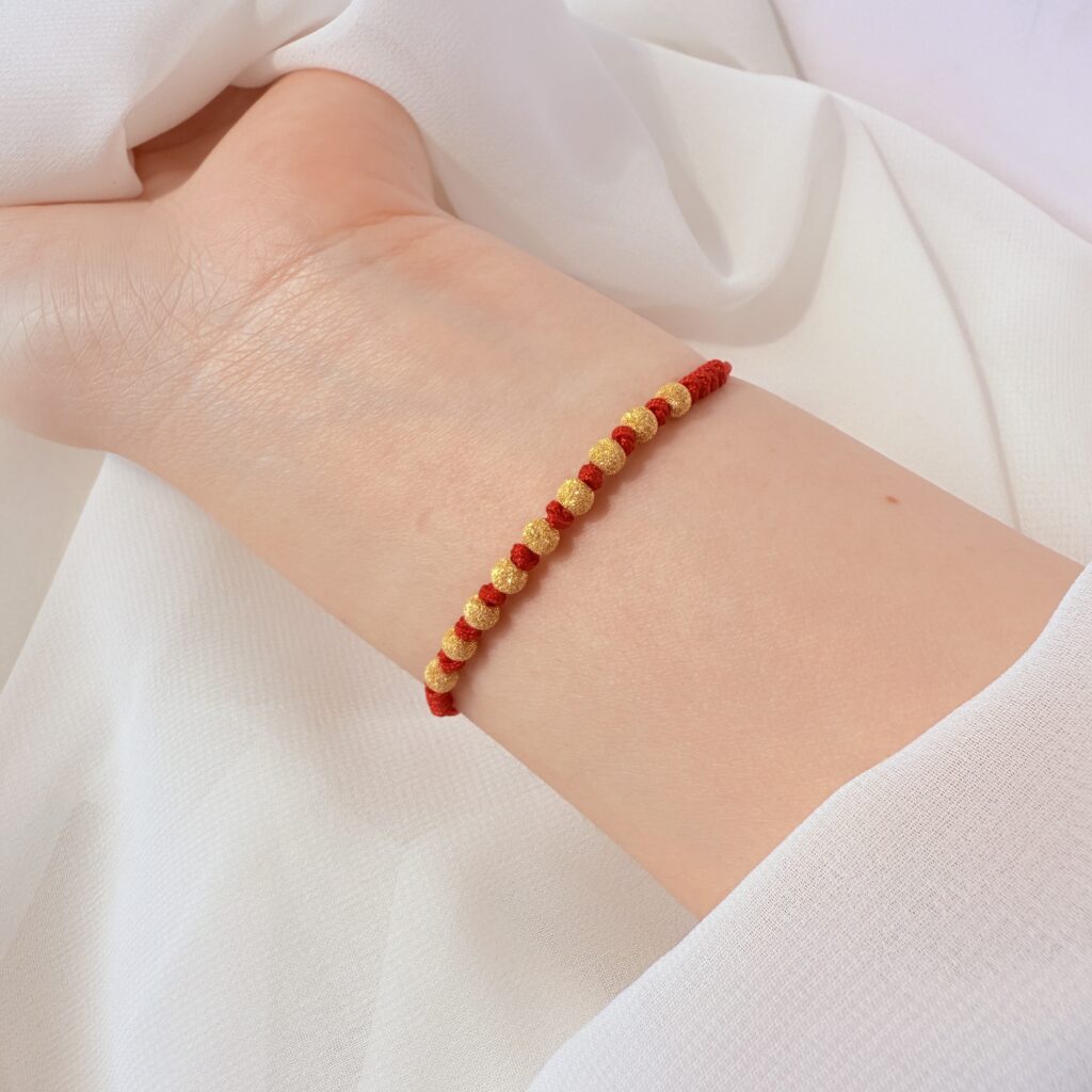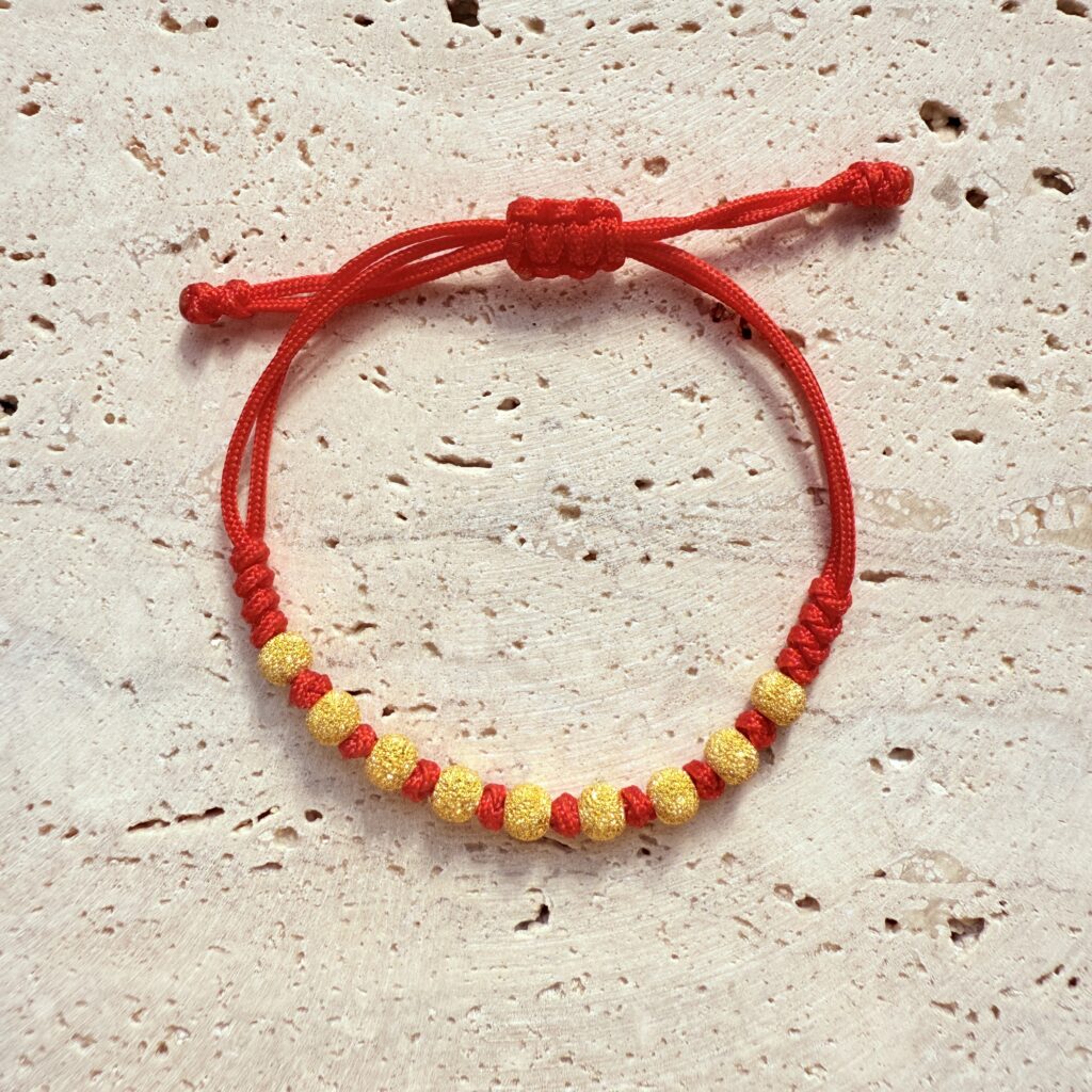 手工編織紅繩串以星砂質感金珠,亮眼而不張揚,寓意平安喜運。輕量好戴、可調節尺寸,單戴提氣色、疊搭更有層次,日常配戴或送禮都合適。