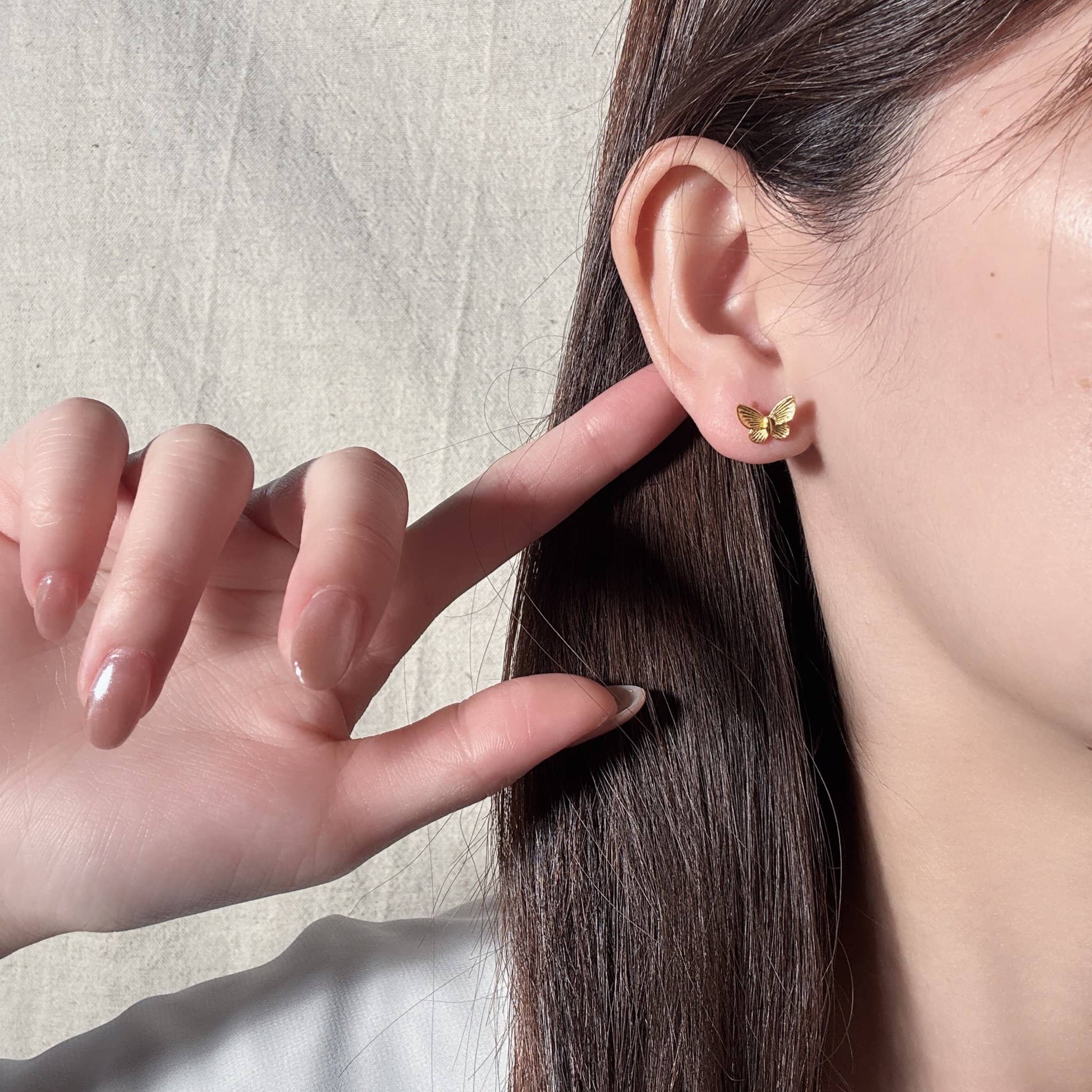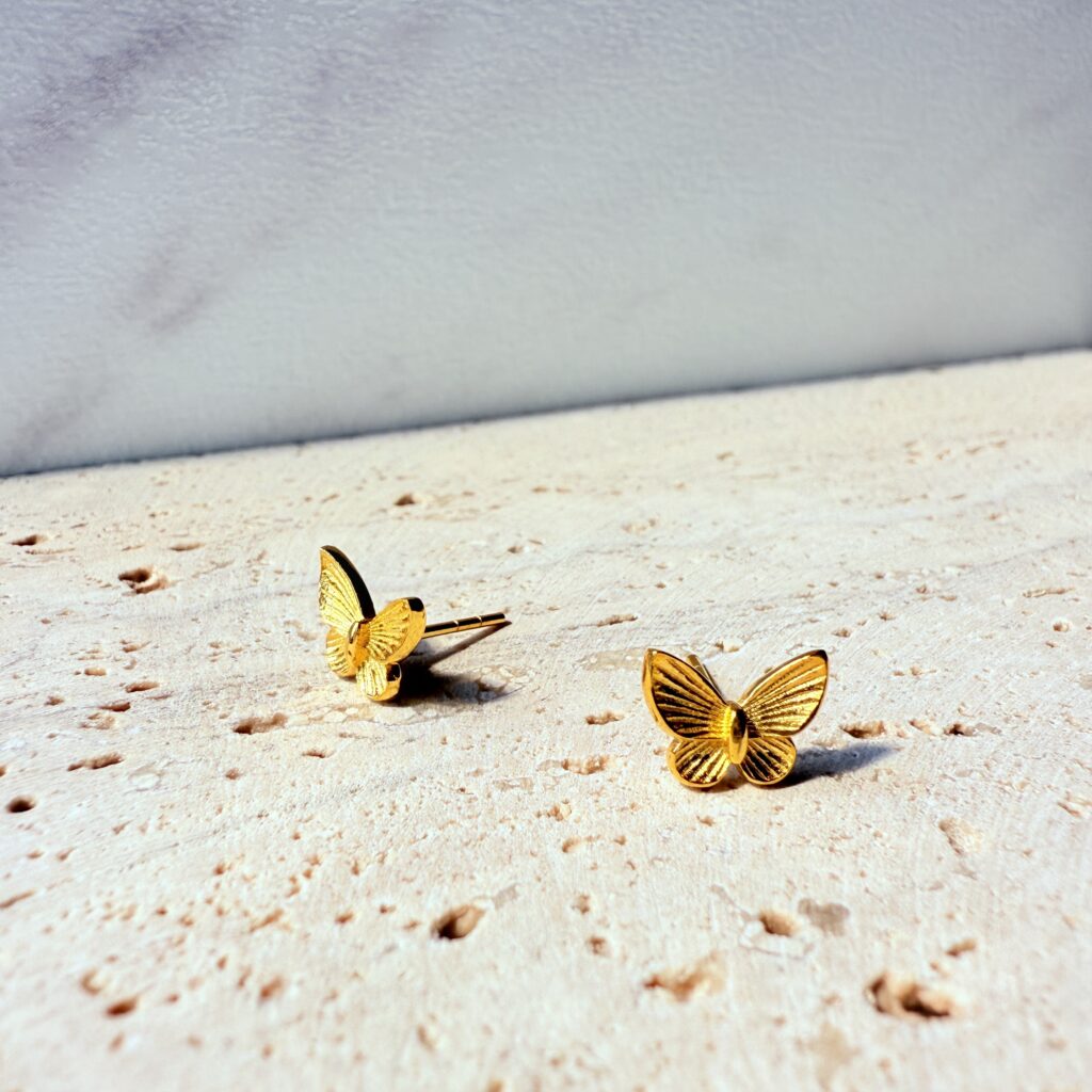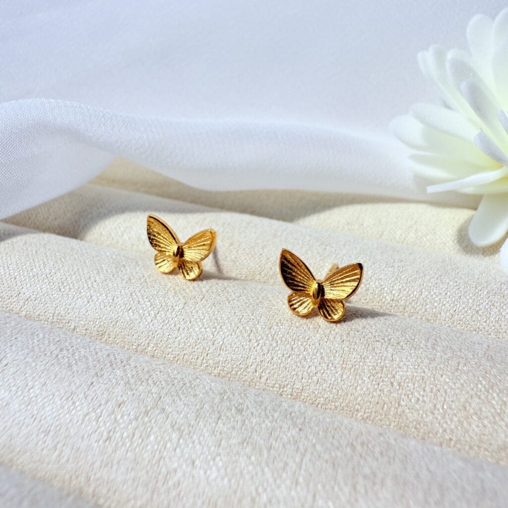 立體蝶翼造型搭配細緻放射紋理,金色光澤在光影間輕閃;小巧貼耳、日常百搭,單戴或混搭皆優雅耐看,送禮自用都合適。