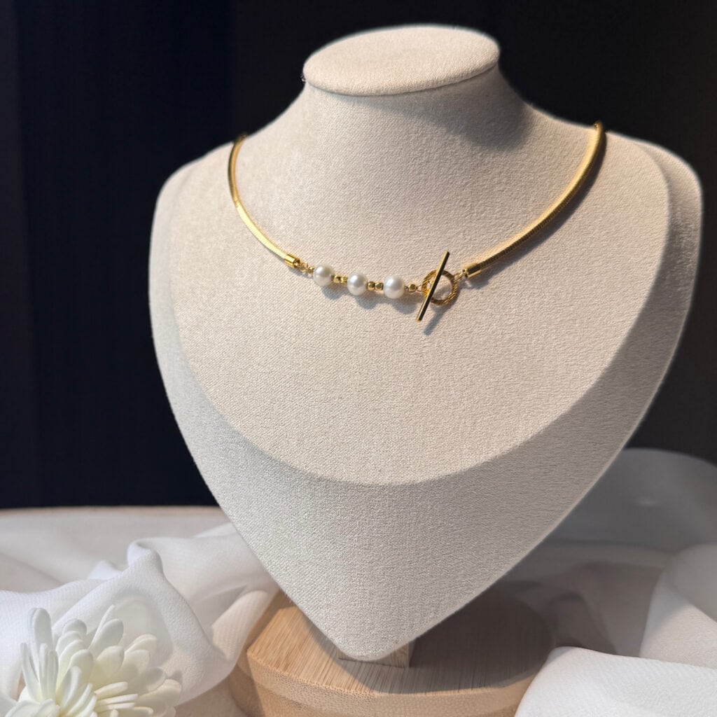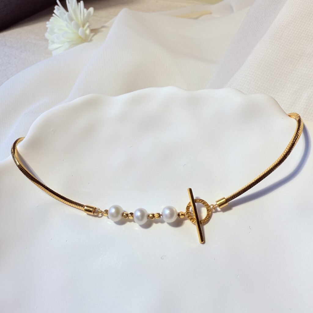蛇骨鍊珍珠黃金項鍊,結合俐落金屬線條與三顆圓潤珍珠,搭配T字扣設計,時尚又典雅。無論是日常穿搭還是宴會場合,都能展現優雅自信的迷人風采。