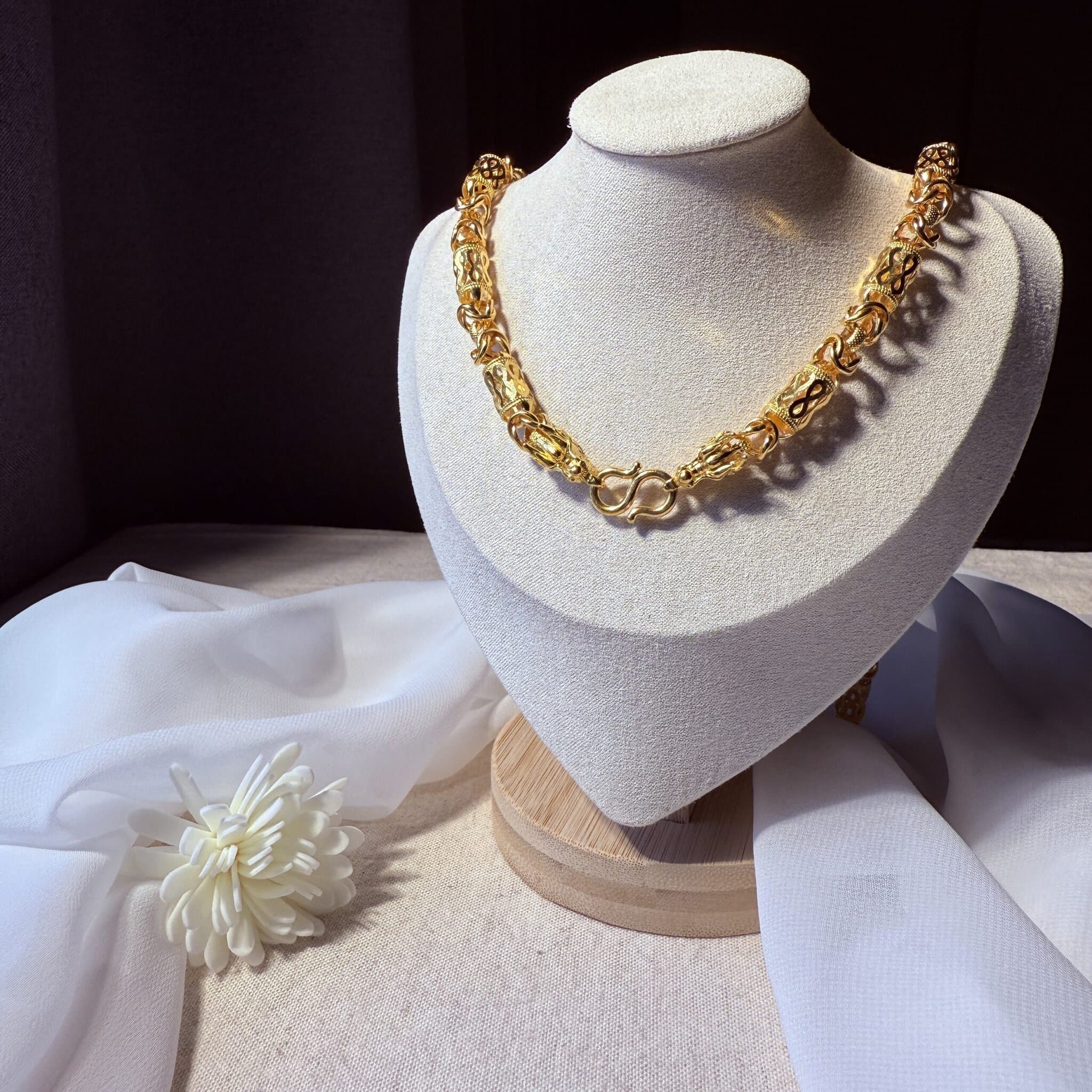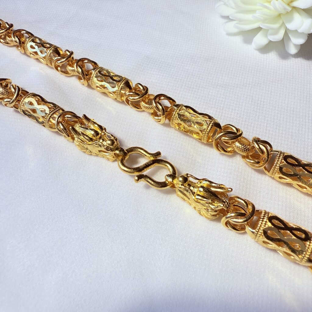 精工打造龍頭扣黃金項鍊,以細緻鏤空雕花圓筒搭配霸氣龍首設計,象徵權威與守護,不僅展現厚實份量,更蘊含聚財吉祥寓意,無論配戴或收藏皆具尊榮氣勢。