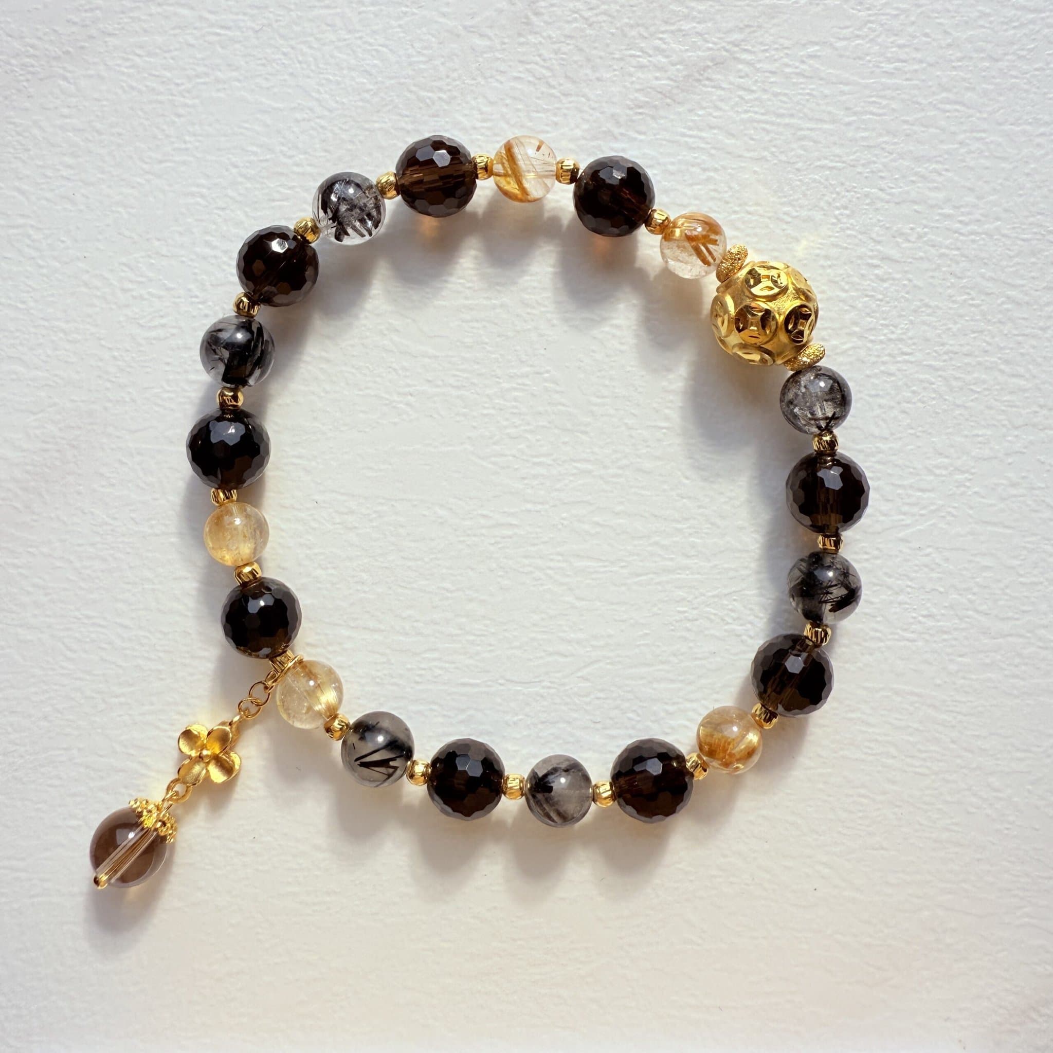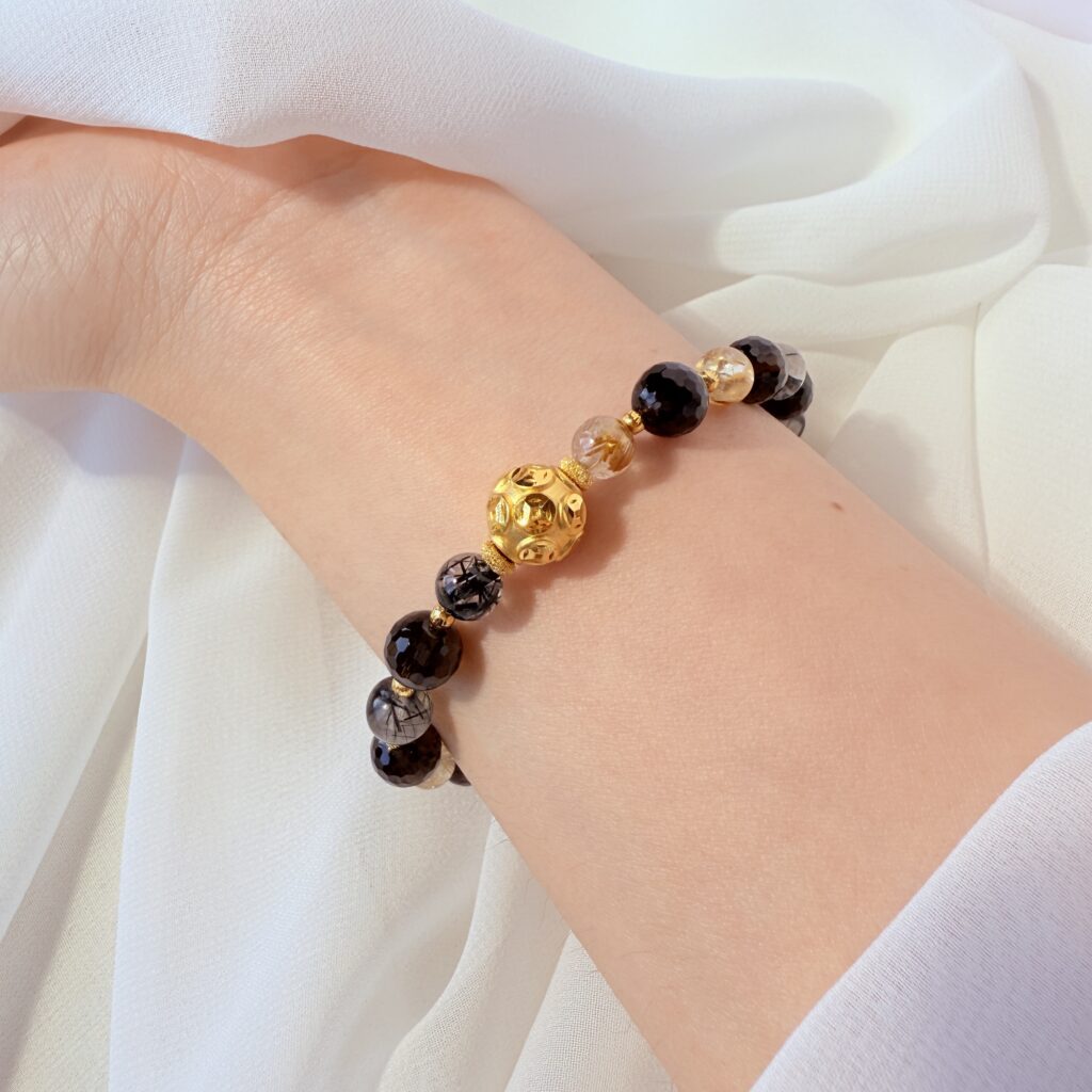 結合黃金圓珠與多色能量晶石,展現高貴氣質與守護寓意。精緻設計不僅適合日常佩戴,更象徵財富與好運的到來。