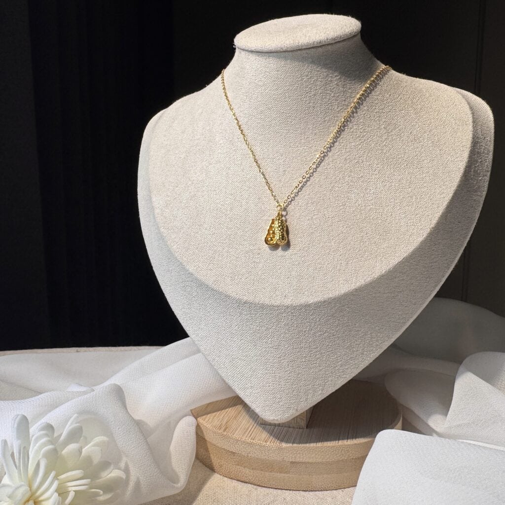 以花生造型寓意「好事發生」,金黃溫潤與細膩雕工交織出獨特質感。赫田銀樓嚴選設計,將吉祥祝福融入日常穿搭與心意禮贈。