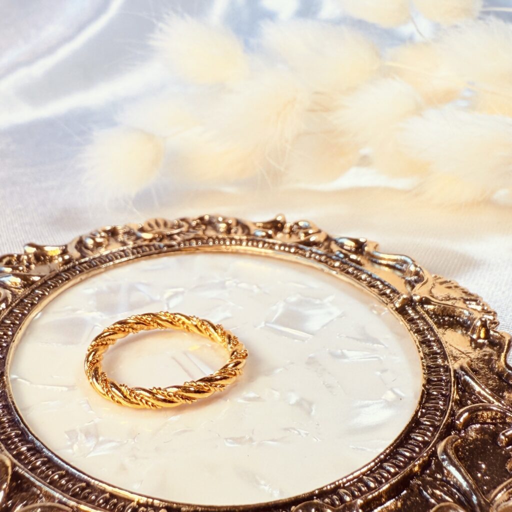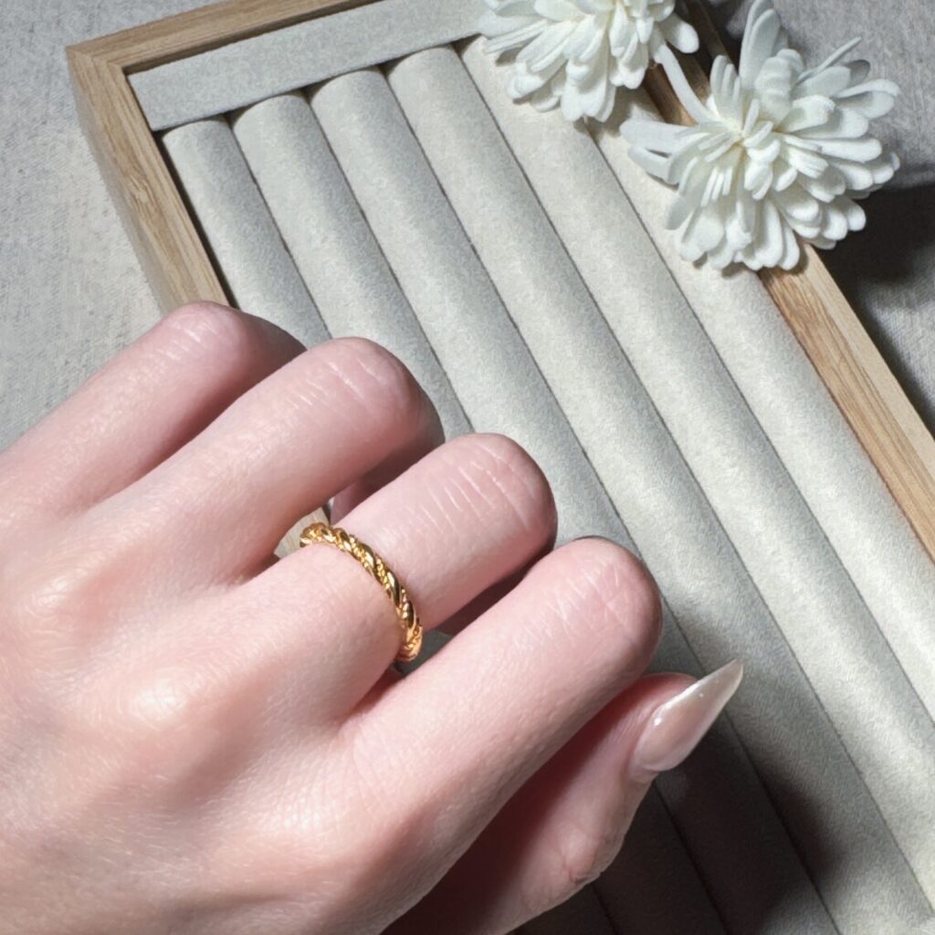 以細緻的編織紋路呈現柔美曲線,宛如藤蔓纏繞指尖,閃耀溫潤金光。典雅又耐看,日常佩戴或搭配禮服都能展現精緻氛圍,讓妳舉手投足間散發優雅光彩。