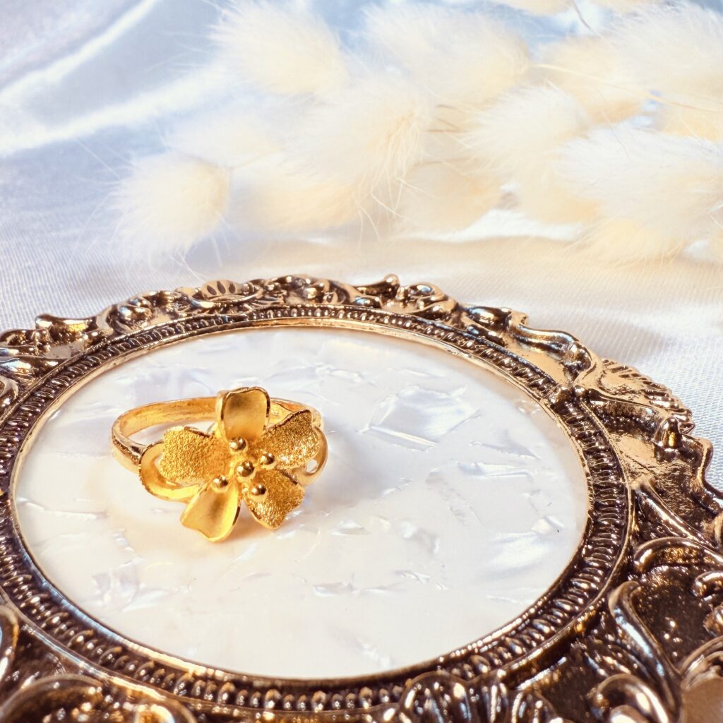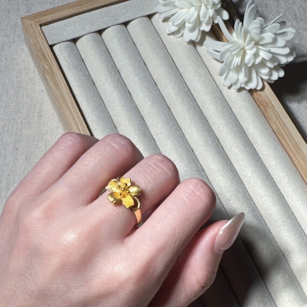 燦爛綻放的金色花朵,將自然的靈動融入指尖。這款純金戒指立體雕花設計,細緻柔美又富有層次感,適合日常配戴或重要場合,讓妳舉手投足間綻放自信與優雅。