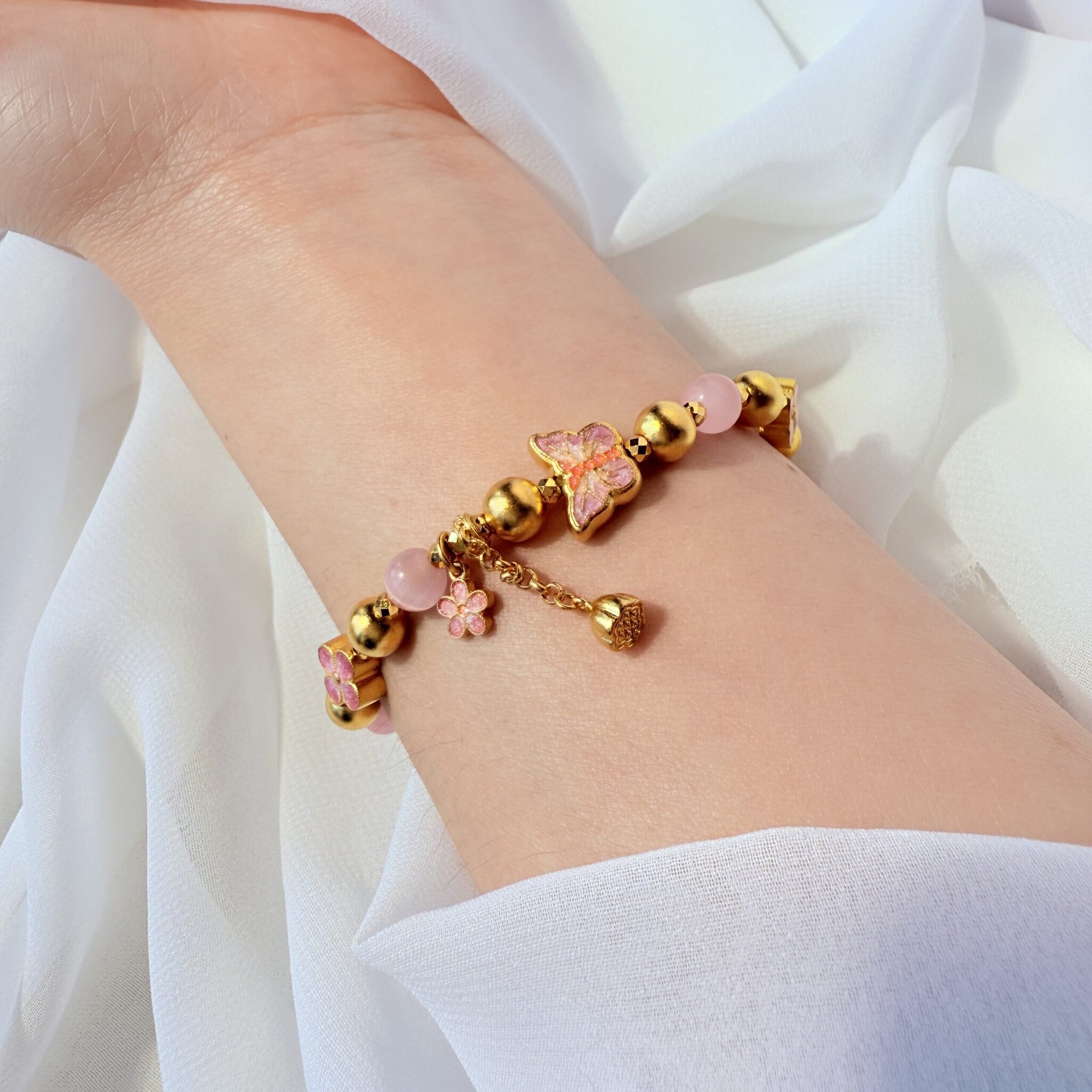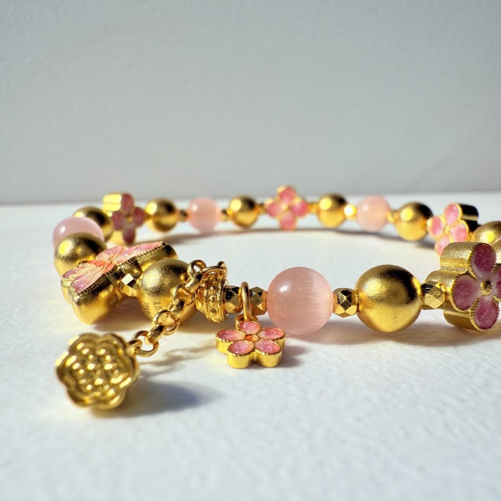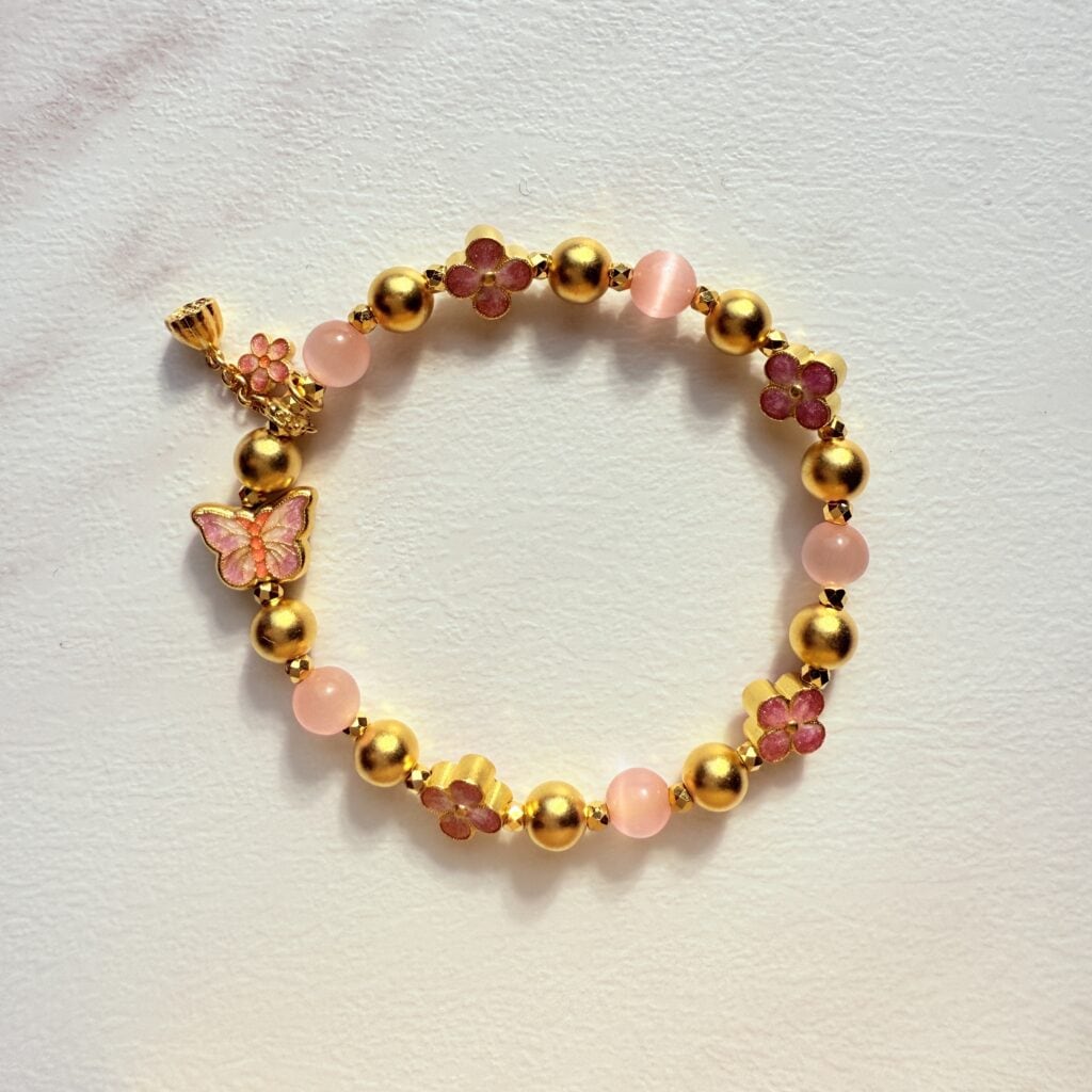 粉色花朵與金珠相互輝映,搭配蝴蝶設計的「金蝶花影手鍊」,展現浪漫甜美氛圍,適合日常穿搭與特別場合,象徵愛情與幸福。