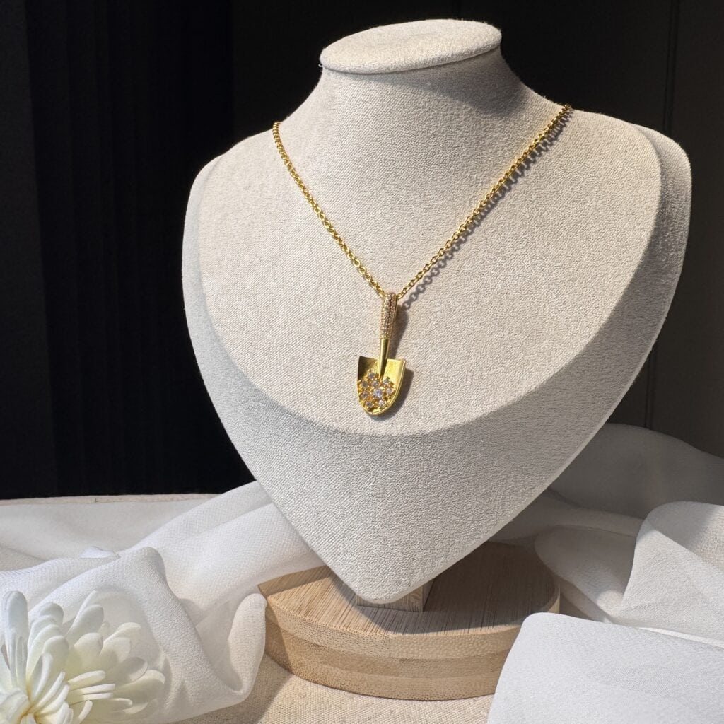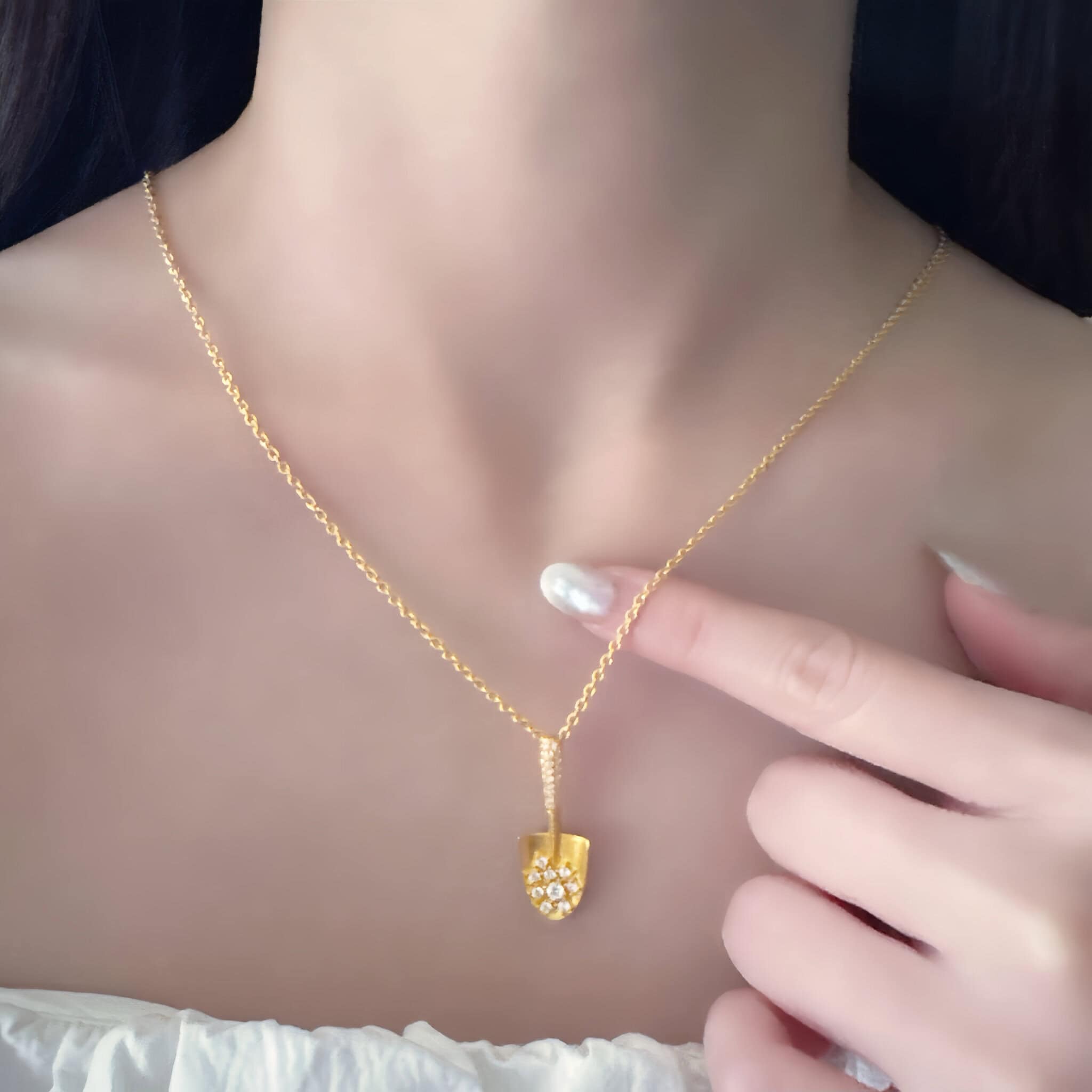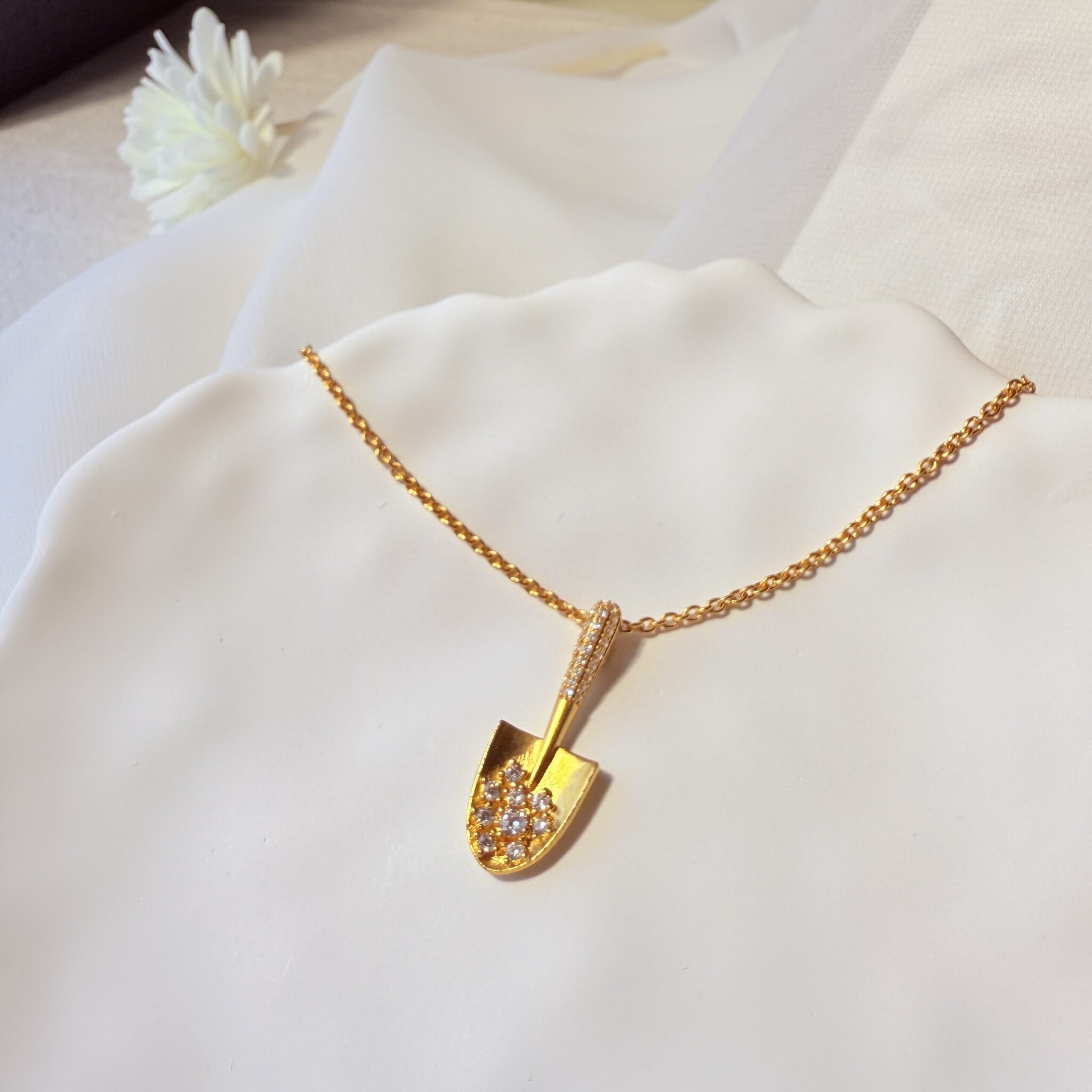 鑽耀金鏟項鍊以純金打造,鑲鑽點綴,寓意耕耘與收穫,象徵財富與開運。簡約設計,日常配戴或送禮都合適。
