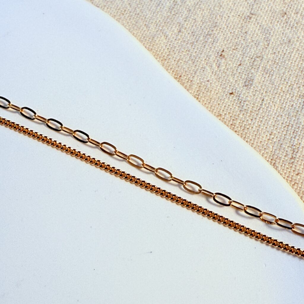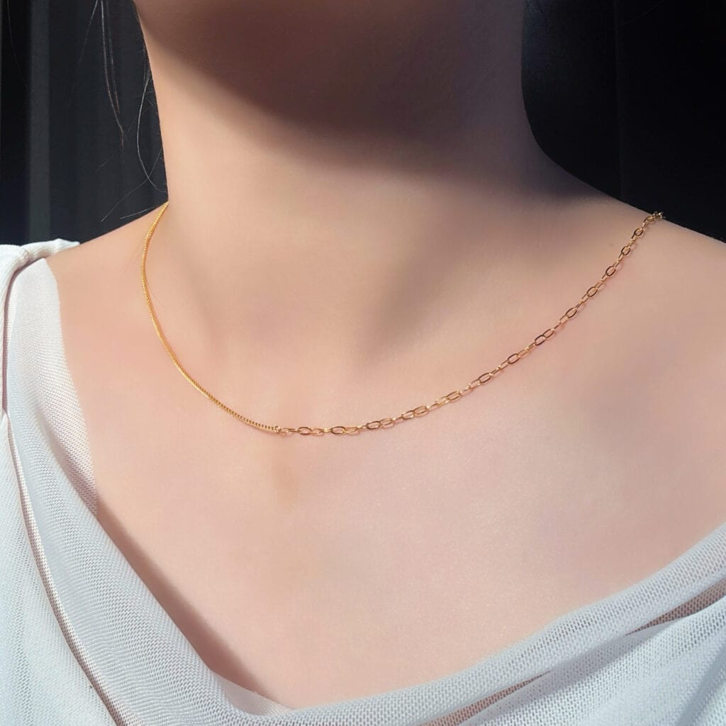 融合小豆鍊與橢圓圈鏈的不對稱設計,讓黃金項鍊在細緻中展現時尚層次感,單戴即可成為亮點,輕奢簡約,百搭又獨特。
