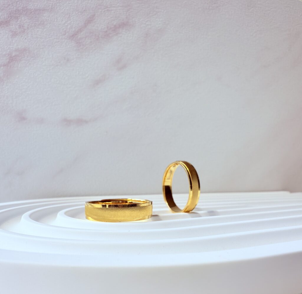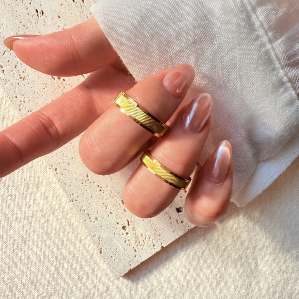 中段鏡面留白結合細緻直紋邊框,亮霧交錯如一道光帶;圓弧內壁滑順貼手,比例俐落,單戴耐看,成對更顯默契。