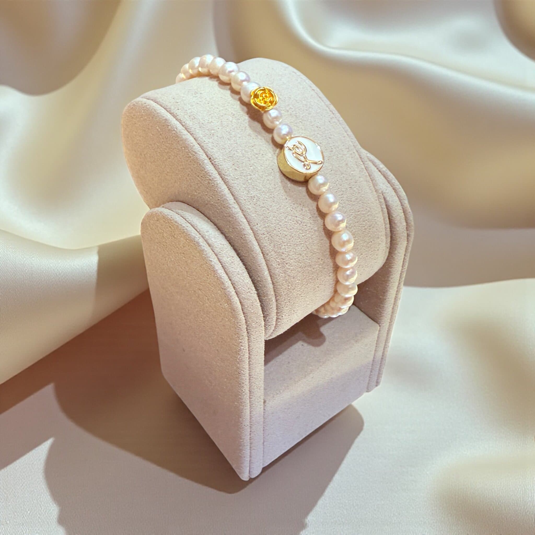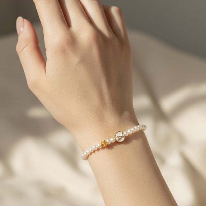 以細緻珍珠串起柔和光澤,綴以金色綁結與小金花點亮細節,呈現溫柔又精緻的手腕氣質。日常到儀式感穿搭皆能輕鬆駕馭,散發恬靜而優雅的美感。