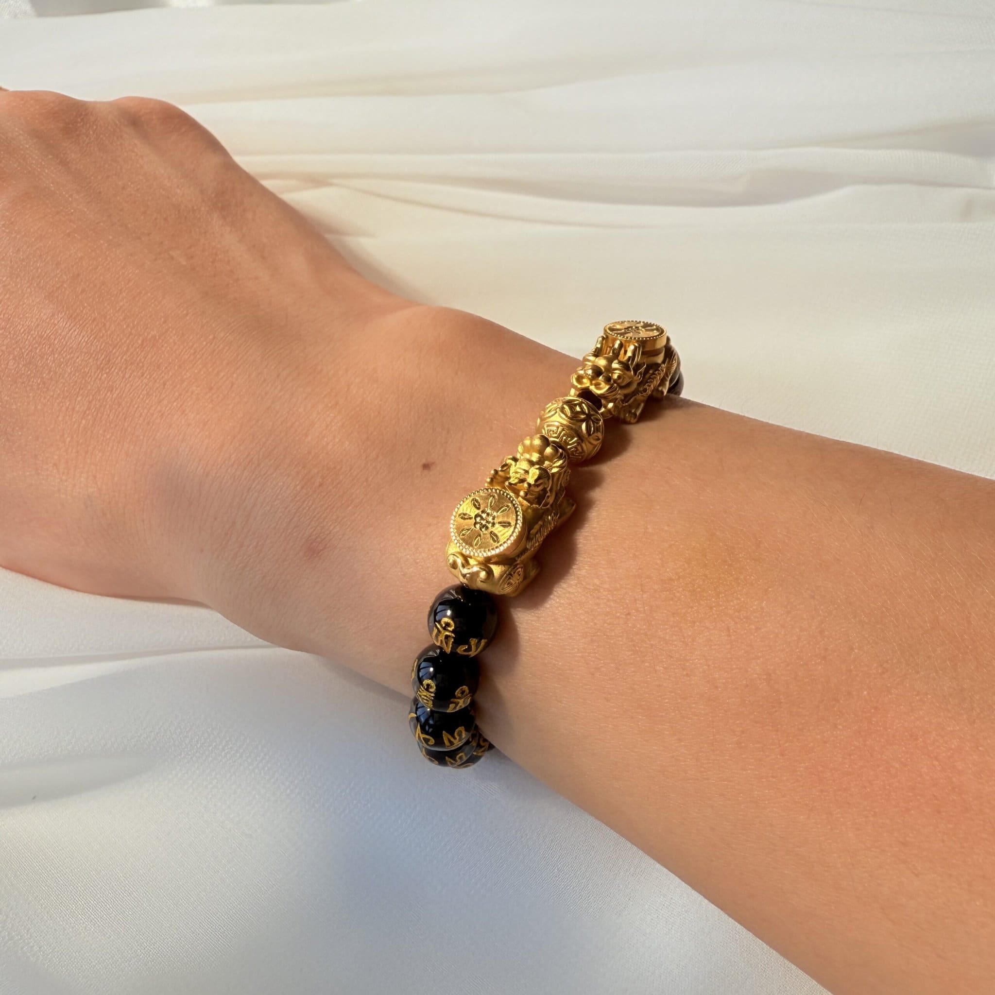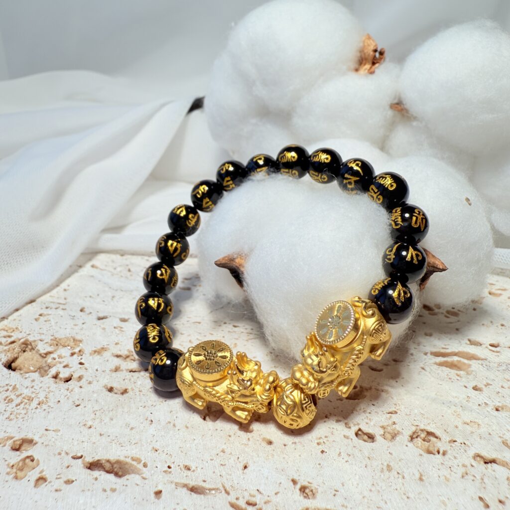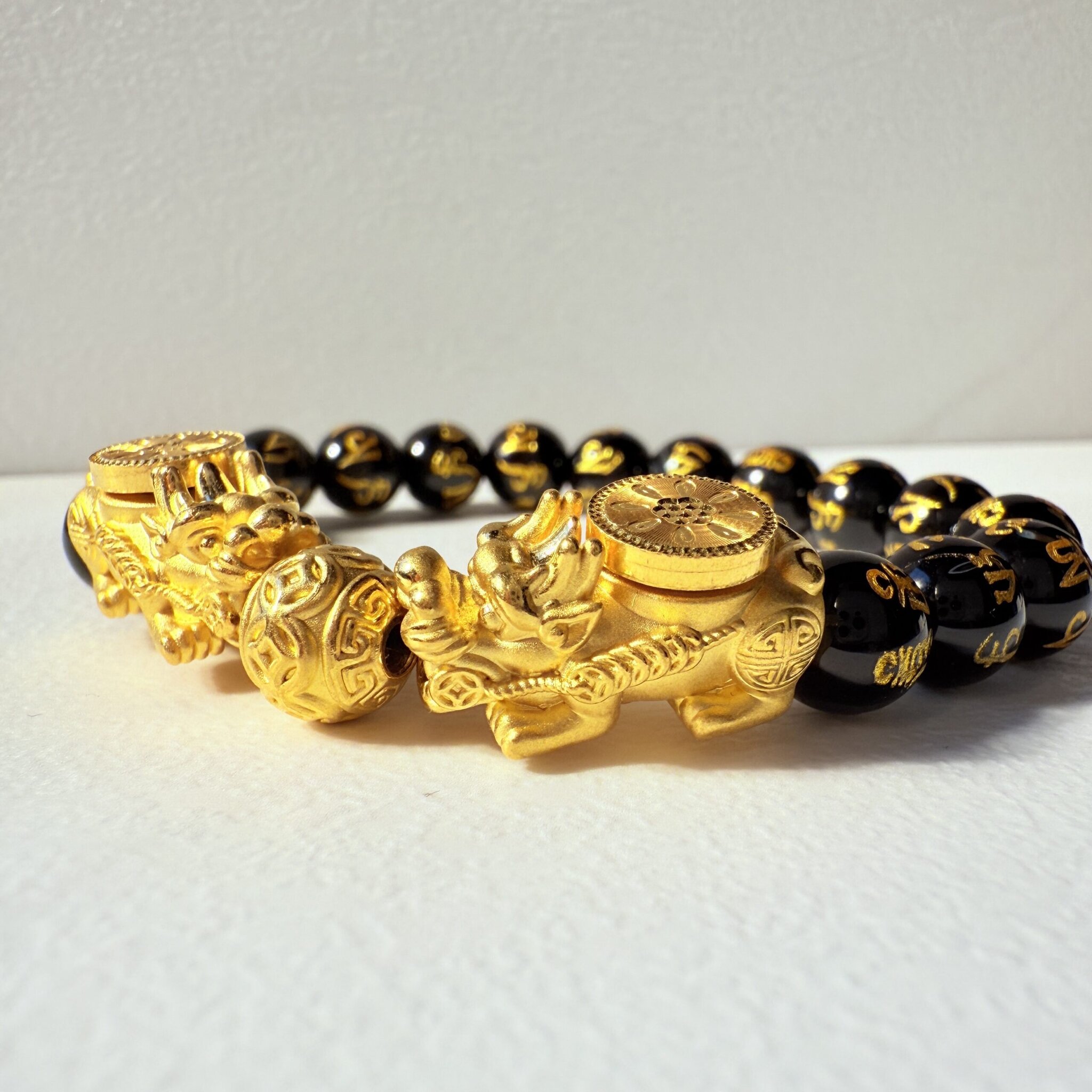 黃金貔貅結合黑色串珠設計,象徵招財、聚福與守護,純金工藝細緻雕刻,搭配黑色珠串更顯穩重大器。適合日常佩戴或作為護身財運禮物,寓意吉祥富貴,長伴左右。