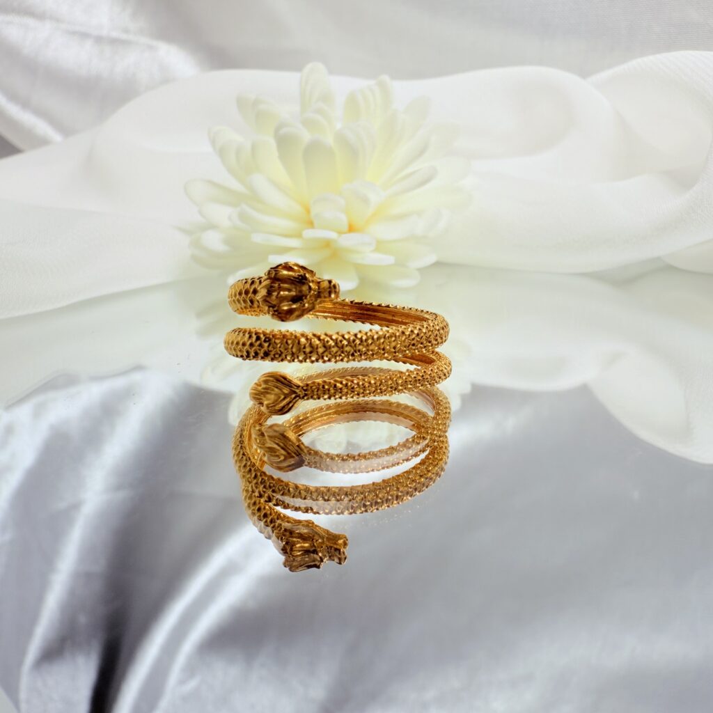 盤龍意象的開口戒指,細緻鱗紋與龍首端飾相映;三圈纏繞勾勒立體層次,純金光澤沉穩,貼手好戴,日常也能展現氣勢與守護感。